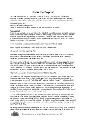 This short reflection/sermon 1213 words explores the life of John the Baptist. His significance is explored from his birth until his death. Particular emphasis is placed on his relationship with Jesus. His significance for people both then and now is also examined.