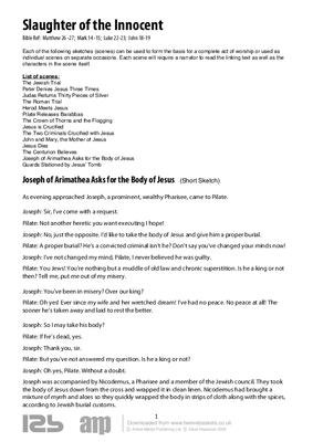 Each of the following sketches (scenes) can be used to form the basis for a complete act of worship or used as individual scenes on separate occasions. Each scene will require a narrator to read the linking text as well as the characters in the scene itself.