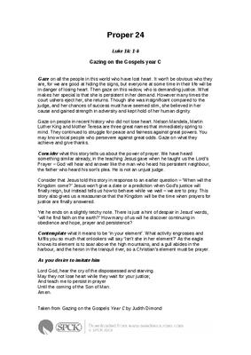 Gaze on all the people in this world who have lost heart. It won’t be obvious who they are, for we are good at hiding the signs, but everyone at some time in their life will be in danger of losing heart. Then gaze on this widow, who is demanding justice. What makes her special is that she is persistent in her demand. However many times the court ushers eject her, she returns. Though she was insignificant compared to the judge, and her chances of success must have seemed slim, she believed in her cause and gained strength in adversity and kept hold of her human dignity...