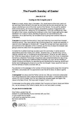 Gaze on a rough, stormy day in Jerusalem. Our usual picture of the Holy Land is of sun and heat, and a life led in the open air, but there can be cold winds and rain, too. Jesus is sheltering in one of the inner courts of the Temple. It’s not just the weather that’s turned stormy, for now he’s trapped, encircled by a group of opponents who harangue and taunt him, willing him on to blaspheme. This is an unofficial trial. Hear the spite in their voices, crackling like kindling on a fire, their threats spitting like water splashed in oil. Gaze on Jesus, standing his ground, not overwhelmed by the opposition. He is sad that they ‘do not believe’ but is giving them another chance to understand...