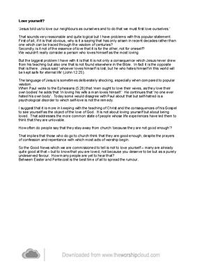 But the biggest problem I have with it is that it is not only a consequence which Jesus never drew from his teaching but also one that is not found elsewhere in the Bible. In fact it is the opposite that is there. Jesus said ‘whoever loves himself is lost, but he who hates himself in this world will be kept safe for eternal life’ (John 12:25). The language is Jesus is sometimes deliberately shocking, especially when compared to popular wisdom. When Paul wrote to the Ephesians (5:28) that ‘men ought to love their wives, as they love their own bodies’ he adds that ‘In loving his wife a man loves himself.’ He continues that ‘no one ever hated his own body’. Today some would disagree with Paul about that but self-hatred is a psychological disorder to which self-love is not the remedy.