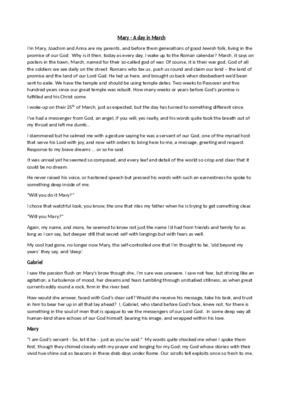 Mary remembers and recounts her meeting with the Angel Gabriel who interposes some of his memories of the meeting. Suitable for reflection on the annunciation or for a reading in a service. Lasts about 10 minutes. Could be shortened.