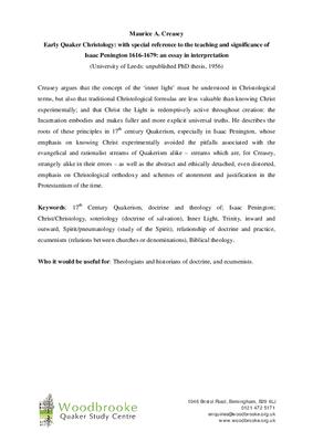 Keywords: 17th Century Quakerism, doctrine and theology of; Isaac Penington; Christ/Christology, soteriology (doctrine of salvation), Inner Light, Trinity, inward and outward, Spirit/pneumatology (study of the Spirit), relationship of doctrine and practice, ecumenism (relations between churches or denominations), Biblical theology.
