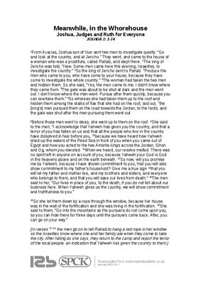In this commentary, Joshua 2 is the only chapter for which I will not attempt to provide an opening story in accordance with the usual format of The Old Testament for Everyone series. How could I compete with this actual story about the adventure of two nice Jewish boys in the Jericho whorehouse (the same dynamic applies to the story in Genesis 29 about Jacob waking up and finding he has married the wrong girl) as a result of being sent off on an expedition by Joshua?...