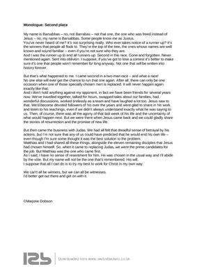 My name is Barsabbas – no, not Barrabas – not that one, the one who was freed instead of Jesus – no, my name is Barsabbas. Some people know me as Justus. You’ve never heard of me? It’s not surprising really. Who ever takes notice of a runner-up? It’s the winners that people all flock to. They’re the top of the tree, the ones whose names are well known and sound familiar – even if you’re not sure who they are. And I was the runner-up to end all runners-up. Second in the race. Gone and forgotten. Never mentioned again. Sent into oblivion. I suppose, if you’ve got to lose a contest it’s better to make sure it’s one that people won’t remember for long anyway. Not one that will be written into history forever. But that’s what happened to me. I came second in a two-man race – and what a race! No one else will ever get the chance to run that one again. After all, there can only be one occasion when one of those specially chosen men is replaced. It will never happen again exactly like that.