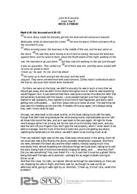 ...So there we were on the boat, we didn’t know why he was in such a hurry that we should get away, and we didn’t know where he’d gone now or what he was expecting would happen next. It just seemed that there was quite a sense of excitement after that extraordinary business with the loaves – once people had got over their hunger they started to ask questions, they wanted to know how it had happened, and some were getting very enthusiastic . . . and then Jesus told us to leave at once. The last thing we saw was him heading up into the hills. Probably off to pray again, he’s always doing that, wish I knew what he said.