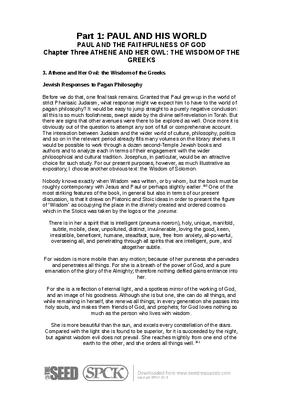 Before we do that, one final task remains. Granted that Paul grew up in the world of strict Pharisaic Judaism, what response might we expect him to have to the world of pagan philosophy? It would be easy to jump straight to a purely negative conclusion: all this is so much foolishness, swept aside by the divine self-revelation in Torah. But there are signs that other avenues were there to be explored as well. Once more it is obviously out of the question to attempt any sort of full or comprehensive account. The interaction between Judaism and the wider world of culture, philosophy, politics and so on in the relevant period already fills many volumes on the library shelves. It would be possible to work through a dozen second-Temple Jewish books and authors and to analyze each in terms of their engagement with the wider philosophical and cultural tradition. Josephus, in particular, would be an attractive choice for such study. For our present purposes, however, as much illustrative as expository, I choose another obvious text: the Wisdom of Solomon...