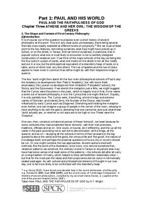 It is of course out of the question to propose even a short history of ancient philosophy at this point. This is in any case quite unnecessary, there being several first-rate ones readily available at different levels of complexity.32 But we must at least point to the key features, reminding ourselves what Saul might have picked up in school, or on the street, in Tarsus. And we remind ourselves, in particular, that in popular culture what one is most likely to encounter is not a carefully designed construction of whatever sort. If we think of the major schools of the day as being like the four suits in a pack of cards, what one meets on the street is not all four neatly laid out in a row, but the philosophical equivalent of a disorderly heap of cards on a table, some of which look very like others. The two of spades and the two of clubs appear to have more in common than either might do with their respective kings or queens...