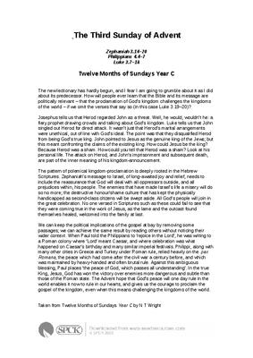 Josephus tells us that Herod regarded John as a threat. Well, he would, wouldn’t he: a fiery prophet drawing crowds and talking about God’s kingdom. Luke tells us that John singled out Herod for direct attack. It wasn’t just that Herod’s marital arrangements were unethical, out of line with God’s ideal. The point was that they disqualified Herod from being God’s true king. John pointed to Jesus as the genuine king of the Jews; but this meant confronting the claims of the existing king. How could Jesus be the king? Because Herod was a sham. How could you tell that Herod was a sham? Look at his personal life. The attack on Herod, and John’s imprisonment and subsequent death, are part of the inner meaning of his kingdom-announcement...