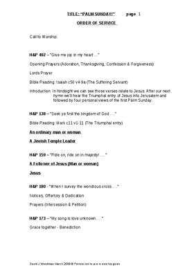 Four Palm Sunday dialogues - looking at the entry of Jesus into Jerusalem from the perspective of 4 individuals involved in the first Palm Sunday. Namely; A bystander, A religious leader, A disciple, & Jesus. A possible order of service as first used also included.