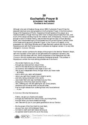 Although only part of Anglican liturgy since 1980, Eucharistic Prayer B has the deepest historical roots, being based on the Eucharistic Prayer in the third-century liturgy of St Hippolytus of Rome. Hippolytus himself speaks of his prayer as a received tradition, though that may refer more to shape and principle than text, and much of the actual wording may be the creative work of Hippolytus. The text, unused through most of Christian history, was revived through the work of Dom Bernard Botte, who incorporated many of its phrases into the current Roman Catholic Order of the Mass as its second Eucharistic Prayer. In the Church of England, in the preparation for ASB, Brian Brindley and Roger Beckwith worked with the text from Hippolytus and with the Roman prayer to produce an Anglican version. It is very little changed in Common Worship…