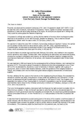 Recently we observed the sixteenth centenary of St. John Chrysostom’s death (407–2007). It can be said that John of Antioch, nicknamed “Chrysostom,” that is, “golden-mouthed,” because of his eloquence, is also still alive today because of his works. An anonymous copyist left in writing that “they cross the whole globe like flashes of lightning.”…