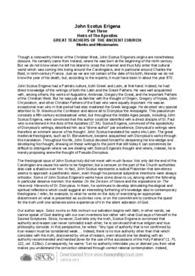 Though a noteworthy thinker of the Christian West, John Scotus Erigena’s origins are nonetheless obscure. He certainly came from Ireland, where he was born at the beginning of the ninth century. But we do not know when he left his island to cross the channel and thus fully enter that cultural world which was coming into being around the Carolingians, and in particular around Charles the Bald, in ninth-century France. Just as we are not certain of the date of his birth, likewise we do not know the year of his death; but, according to the experts, it must have been in about the year 870…