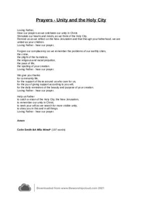 In this prayer celebrate Christian unity is celebrated by considering St John’s vision of the holy city, the New Jerusalem, anticipated in Revelation 21. The Holy city is contrasted with the current situation, particularly as it relates to present day cities