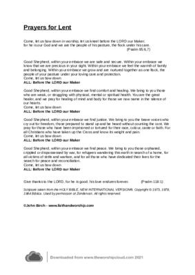 Intercessions for use during the season of Lent, with responses Good Shepherd, within your embrace we are safe and secure. Within your embrace we know that we are precious in your sight. Within your embrace we feel the warmth of family and belonging. Within your embrace we grow and are nurtured together as one flock, the people of your pasture under your loving care and protection. Come, let us bow down ALL: Before the LORD our Maker.