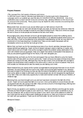 In 2005 the church I attend, (Westborough Methodist in Scarborough) held a Stewardship campaign and in our publicity we used the title of A CHURCH FOR ALL REASONS.. One of our publications was a prayer-card for everyone and every day, allowing reflection on the church and its purpose in the community. These prayers may be helpful for other churches re-examining their role and their mission.)