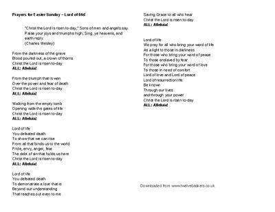 New prayers that can be used as intercessions on Easter Sunday with a theme of 'Christ the Lord is risen today' . From the darkness of the grave Blood poured out, a crown of thorns Christ the Lord is risen to-day ALL: Alleluia! . From the triumph that is won Over the power and fear of death Christ the Lord is risen to-day ALL: Alleluia! .........................................