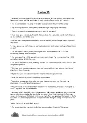 This reflection/commentary is a very personal Psalm attributed to David who seeks to lift our Spirits. It is suitable as a short talk or sermon (1315 words) It strongly emphasises the beauty of the natural world. and Gods faithfulness, God's Laws are also seen as beautiful and support this interpretation. Poetic parallelism gives strength to the meaning of the Psalm..