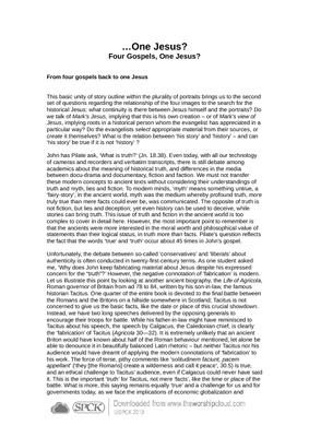 This basic unity of story outline within the plurality of portraits brings us to the second set of questions regarding the relationship of the four images to the search for the historical Jesus: what continuity is there between Jesus himself and the portraits? Do we talk of Mark’s Jesus, implying that this is his own creation – or of Mark’s view of Jesus, implying roots in a historical person whom the evangelist has appreciated in a particular way? Do the evangelists select appropriate material from their sources, or create it themselves? What is the relation between ‘his story’ and ‘history’ – and can ‘his story’ be true if it is not ‘history’ ?…