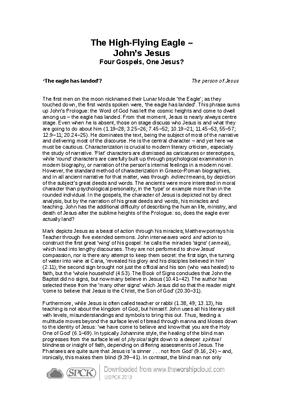 The first men on the moon nicknamed their Lunar Module ‘the Eagle’; as they touched down, the first words spoken were, ‘the eagle has landed’. This phrase sums up John’s Prologue: the Word of God has left the cosmic heights and come to dwell among us – the eagle has landed. From that moment, Jesus is nearly always centre stage. Even when he is absent, those on stage discuss who Jesus is and what they are going to do about him (1.19–28; 3.25–26; 7.45–52; 10.19–21; 11.45–53, 55–57; 12.9–11; 20.24–25). He dominates the text, being the subject of most of the narrative and delivering most of the discourse. He is the central character – and yet here we must be cautious. Characterization is crucial to modern literary criticism, especially the study of narrative. ‘Flat’ characters are dismissed as caricatures or stereotypes, while ‘round’ characters are carefully built up through psychological examination in modern biography, or narration of the person’s internal feelings in a modern novel. However, the standard method of characterization in Graeco-Roman biographies, and in all ancient narrative for that matter, was through indirect means, by depiction of the subject’s great deeds and words. The ancients were more interested in moral character than psychological personality, in the ‘type’ or example more than in the rounded individual. In the gospels, the character of Jesus is depicted not by direct analysis, but by the narration of his great deeds and words, his miracles and teaching. John has the additional difficulty of describing the human life, ministry, and death of Jesus after the sublime heights of the Prologue: so, does the eagle ever actually land?…