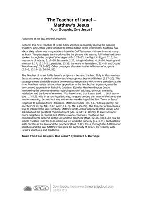 Second, this new Teacher of Israel fulfils scripture repeatedly during the opening chapters, and Jesus uses scripture to defeat Satan in the wilderness. Matthew has about sixty references or quotations from the Old Testament – three times as many as Mark. Ten passages are introduced by the phrase ‘this was to fulfil what had been spoken through the prophet’ (the virgin birth, 1.22–23; the flight to Egypt, 2.15; the massacre of infants, 2.17–18; Nazareth, 2.23; living in Galilee, 4.14–16; healing and ministry, 8.17; 12.17–21; parables, 13.35; the entry to Jerusalem, 8.17; 12.17–21; and Judas’ ‘blood money’, 27.9–10). Other passages also refer to the fulfilment of scripture (2.5–6; 13.14–15; 26.54, 56)…