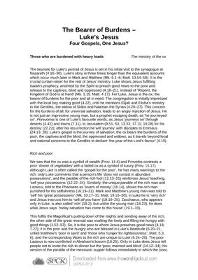 The keynote for Luke’s portrait of Jesus is set in his initial visit to the synagogue at Nazareth (4.16–30). Luke’s story is three times longer than the equivalent accounts which occur much later in Mark and Matthew (Mk. 6.1–6; Matt. 13.54–58). It is the crucial curtain-raiser for the rest of Jesus’ ministry. Luke shows Jesus fulfilling Isaiah’s prophecy, anointed by the Spirit to preach good news to the poor and release to the captives, blind and oppressed (4.18–21), instead of ‘Repent, the Kingdom of God is at hand’ (Mk. 1.15: Matt. 4.17)…