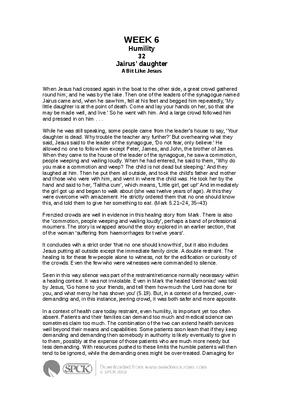 When Jesus had crossed again in the boat to the other side, a great crowd gathered round him; and he was by the lake. Then one of the leaders of the synagogue named Jairus came and, when he saw him, fell at his feet and begged him repeatedly, ‘My little daughter is at the point of death. Come and lay your hands on her, so that she may be made well, and live.’ So he went with him. And a large crowd followed him and pressed in on him . . .