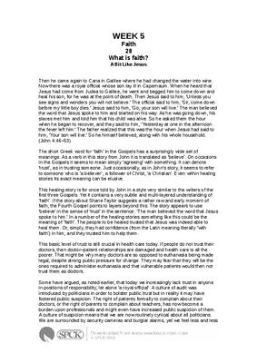 Then he came again to Cana in Galilee where he had changed the water into wine. Now there was a royal official whose son lay ill in Capernaum. When he heard that Jesus had come from Judea to Galilee, he went and begged him to come down and heal his son, for he was at the point of death. Then Jesus said to him, ‘Unless you see signs and wonders you will not believe.’ The official said to him, ‘Sir, come down before my little boy dies.’ Jesus said to him, ‘Go; your son will live.’ The man believed the word that Jesus spoke to him and started on his way. As he was going down, his slaves met him and told him that his child was alive. So he asked them the hour when he began to recover, and they said to him, ‘Yesterday at one in the afternoon the fever left him.’ The father realized that this was the hour when Jesus had said to him, ‘Your son will live.’ So he himself believed, along with his whole household...