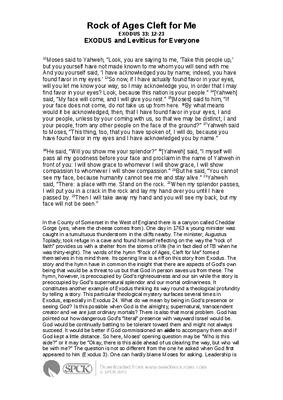 In the County of Somerset in the West of England there is a canyon called Cheddar Gorge (yes, where the cheese comes from). One day in 1763 a young minister was caught in a tumultuous thunderstorm in the cliffs nearby. The minister, Augustus Toplady, took refuge in a cave and found himself reflecting on the way the “rock of faith” provides us with a shelter from the storms of life (he in fact died of TB when he was thirty-eight). The words of the hymn “Rock of Ages, Cleft for Me” formed themselves in his mind there. Its opening line is a riff on this story from Exodus...