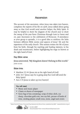 The account of the ascension, when Jesus was taken into heaven, completes the reports of his life on earth. Jesus talked about going away so that God would send another helper, the Holy Spirit. It may be helpful to show the diagram of the church year to show the sweep of the year from Christmas through Lent to Easter and on, past Ascension to the celebration of Pentecost. If attendance at your group is sporadic, it is a good idea to reinforce the links between different Bible stories and aspects of Jesus' life and the experience of the early church. This session revises the life of Jesus from his birth, through his teaching and healing ministry, to his death and resurrection, before highlighting his reign in heaven at the right hand of God.