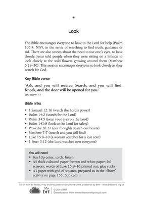 The Bible encourages everyone to look to the Lord for help (Psalm 105:4, NIV), in the sense of searching to find truth, guidance or aid. There are also stories about the need to use one's eyes, to look closely. Jesus told people when they were sitting on a hillside to look closely at the wild flowers growing around them (Matthew 6:28-30). This session encourages everyone to look closely as they search for God.