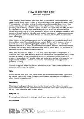 There are fifteen festival outlines in this book, each of them offering something different. They range from the familiar occasions such as Mothering Sunday to the solemn days of Holy Week.1 The ideas that are offered are jumping-off points, and can be adapted and developed in tune with the local situation. It is important to learn what will work in your environment, both practically and emotionally. There are physical limitations and opportunities that differ, and there are congregations that enjoy some approaches to worship, while other activities can be a stumbling block. Although all of these outlines offer different ideas, in reality it is valuable to build confidence through familiarity. Using the same words is important as it enables people to create a memory bank of sacred texts which they can use with ease, allowing them to experience a sense of belonging...