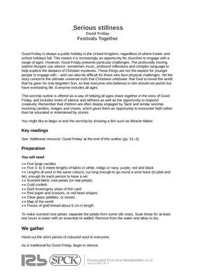 This worship outline is offered as a way of helping all ages share together in the story of Good Friday, and includes times of silence and stillness as well as the opportunity to respond creatively. Remember that children are often deeply engaged by Taizé and similar worship involving candles, images and chants, which gives them an opportunity to encounter faith rather than be educated or entertained by stories...
