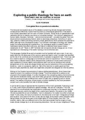 The temporal and spatial nature of the debates concerning climate change and its likely consequences effectively means that this theme is a theological global flow. That label is most closely associated with the work of Robert Schreiter, whose study on globalization and catholicity led him to identify new forms of ‘universal theology’…