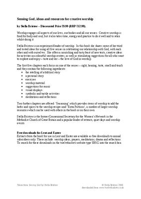 Stella Bristow is an experienced leader of worship. In this book she shares some of her tried and tested ideas for using all five senses in celebrating our relationship with God, with each other and with ourselves. She offers a nourishing and tasty feast of new texts, creative ideas for activities an colourful worship centres, as well as stimulating suggestions for all who want to explore and enjoy – taste and see – the love of God in worship.