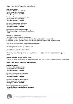 Do we see the signs of the times? Prayers of praise, confession and intercession for times of order, times of chaos and times of fresh start that follow the same pattern so that they can be used in the same service or at intervals recognising our need to respond to the signs of the times.
