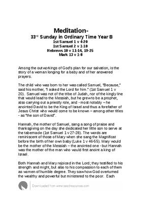 1st Samuel 1 v 4-20 1st Samuel 2 v 1-10 Hebrews 10 v 11-14, 19-25 Mark 13 v 1-8