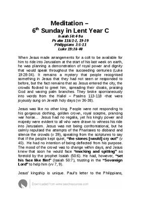 When Jesus made arrangements for a colt to be available for him to ride into Jerusalem at the start of his last week on earth, he was planning a demonstration of royal power and dignity that would speak throughout the succeeding centuries (Luke 19:28-34). It remains a mystery that people recognised something in Jesus that they had not seen or responded to before, but the fact remains that as Jesus entered the city, the crowds flocked to greet him, spreading their cloaks, praising God and waving palm branches. They broke spontaneously into words from the Hallel – Psalms 113-118 -that were joyously sung on Jewish holy days (vv 36-38)...