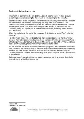 Imagine life in Germany in the late 1930s. A Jewish teacher called Joshua is saying some things which are exciting for the powerless but alarming for the powerful. Soon the Gestapo arrest him, torture him and execute him. They think that's the end of it but then some of his followers begin saying that they have seen him alive. This unauthorised, subversive movement grows and their outrageous declaration is 'Joshua is the Fuhrer!' In that case, Hitler isn't. Now you have an idea of the cost to the first Christians, living in a regime just as totalitarian and ruthless, of saying 'Jesus is Lord ' (so Caesar isn't).