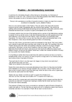 This reflection/short talk (933 words) positively compares Psalms to modern hymns. Their importance in the New Testament is highlighted Also, their poetry and their frequent use of vivid imagery and metaphors is emphasised and illustrated with apt examples.