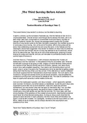 It seems a shame, as the translators’ footnotes say, that the Hebrew of Job 19.26 is ‘incomprehensible’. The old version (‘and though worms destroy this body, yet in my flesh shall I see God’) is engraved on innumerable minds and hearts, courtesy of George Frederick Handel. But, though the passage doesn’t predict the Christian doctrine of resurrection quite as the older translators supposed, the modified account is in some ways more moving. Job, at the end of his tether, affirms that justice will be done; that a defending counsel will live and arise (the word, in the Hebrew and the Septuagint, would have suggested ‘resurrection’ to readers of Jesus’ day) to plead his cause; and that God himself, who for so long had seemed to be his adversary, would be on his side at the last. Take Job as an icon of the whole world, groaning in travail, longing for justice and new life, and you can translate his confidence directly into the cosmic hope of Romans 8...