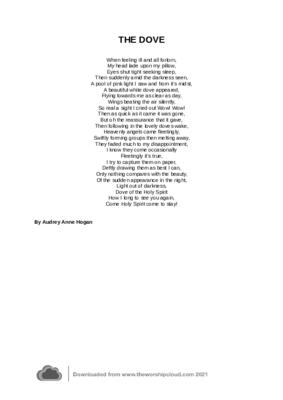"The Dove" is a poem about a very short vision of a dove followed by angels; experienced when suffering from a severe chest infection.The vision was more than a still picture it was a very real moving animated vision. With a response of sheer joy and utter surprise.It instilled hope and reasurance in me for not only myself but also for others whom I knew were suffering severe problems.