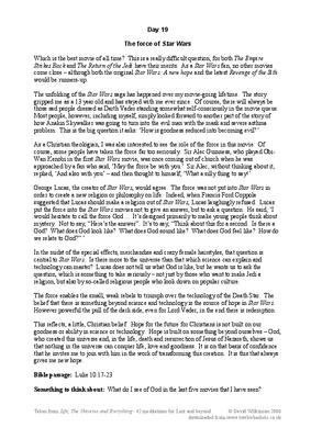 Thoughts taken from TV, Books and life experiences on various topics and given a Christian slant to stimulate thoughts. The topic here for Day 19 is 'Seeing God in the movies' and looking at 'Star Wars'.