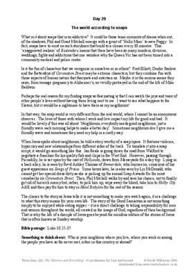 Thoughts taken from TV, Books and life experiences on various topics and given a Christian slant to stimulate thoughts. The topic here for Day 20 is 'Who is my neighbour' and looking at the TV Soaps.
