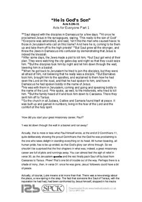 Actually, that is more or less what Paul himself wrote, at the end of 2 Corinthians 11, quite deliberately showing the proud Corinthians that the God he was proclaiming is the one who takes delight in standing everything on its head. All human boasting, all human pride, has to be up-ended, so that God’s glory can shine through. So we shouldn’t be surprised that the first chapters in what was, indeed, a great missionary career are full of plots and runnings away. You can almost feel the sigh of relief in verse 30, as the Jerusalem apostles and the rest finally pack Saul off by boat from Caesarea to Tarsus. Phew! That’s one bit of trouble out of the way. Perhaps there is a shade of irony, then, in verse 31: once he was gone, Jesus’ followers could have a bit of peace...