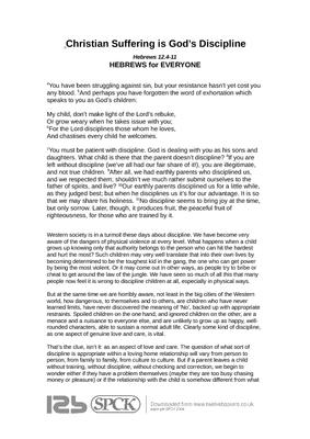 Western society is in a turmoil these days about discipline. We have become very aware of the dangers of physical violence at every level. What happens when a child grows up knowing only that authority belongs to the person who can hit the hardest and hurt the most? Such children may very well translate that into their own lives by becoming determined to be the toughest kid in the gang, the one who can get power by being the most violent. Or it may come out in other ways, as people try to bribe or cheat to get around the law of the jungle. We have seen so much of all this that many people now feel it is wrong to discipline children at all, especially in physical ways...