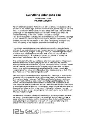 That combination of humility and confidence is hard to keep in balance. The pressure from the world around us is always trying to make us either deny that we know anything or adopt one of those brittle, high-risk, know-it-all positions. Genuine Christian faith isn’t like that. It involves learning to be foolish, as Paul says here, in order to become wise; and it involves celebrating that fact that ‘all things are yours’ while recognizing that ‘you belong to the Messiah, and the Messiah belongs to God’. What does Paul mean by these astonishing statements?...