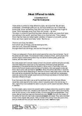 But what people don’t normally realize is that in the ancient world the temples normally were the restaurants. Each town or city had plenty of shrines to local gods and goddesses, to the great divinities like Apollo or Venus, and, in Paul’s day, more and more to the Roman emperor and members of his family. And what people mostly did there was to come with animals for sacrifice. When the animal was killed, it would be cooked, and the family (depending on what sort of ritual it was) might have a meal with the meat as the centrepiece. But there was usually more meat than the worshippers could eat, and so other people would come to the temple and share in the food which had been offered to the god...