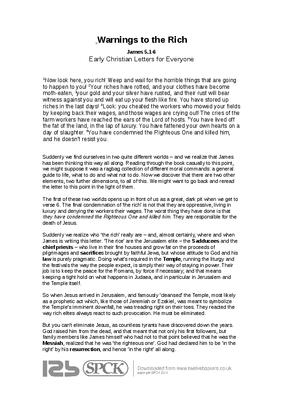 Suddenly we find ourselves in two quite different worlds – and we realize that James has been thinking this way all along. Reading through the book casually to this point, we might suppose it was a ragbag collection of different moral commands: a general guide to life, what to do and what not to do. Now we discover that there are two other elements, two further dimensions, to all of this. We might want to go back and reread the letter to this point in the light of them...
