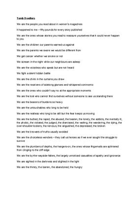 Tomb Dwellers We are the people you read about in women's magazines It happened to me - fifty pounds for every story published We are the ones whose stories you read to reassure yourselves that it could never happen to you We are the children our parents warned us against We are the parents we swore we would be different from